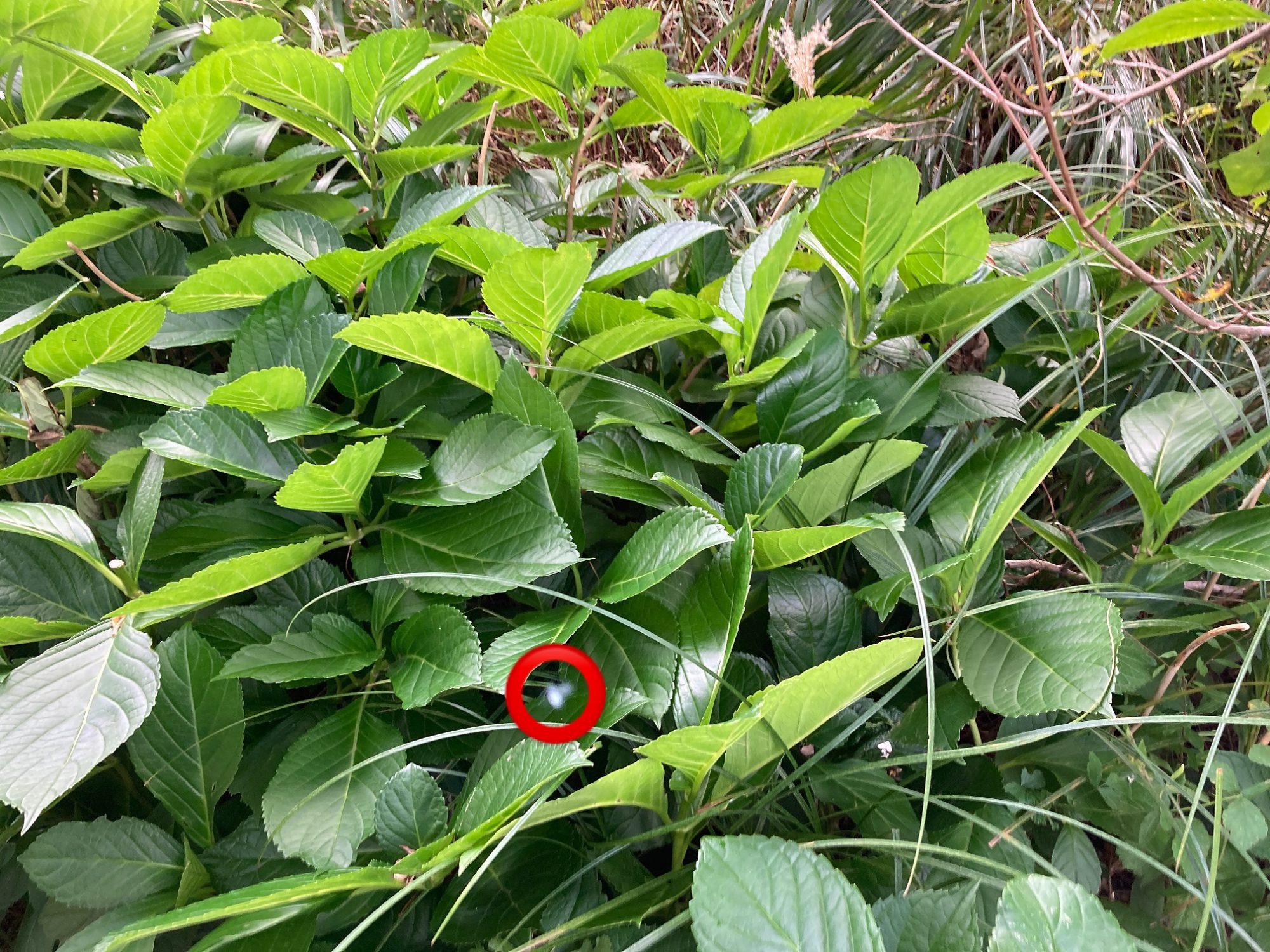 ※ピントが合っていませんが、赤丸印の白いヤツが雪虫です。