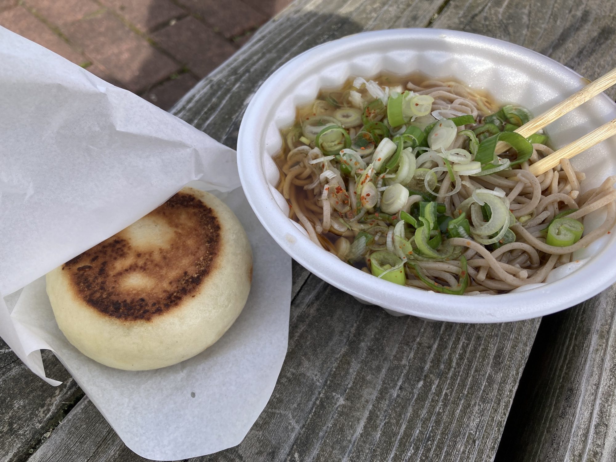 お昼ごはんで、そばと、エゾシカ肉の挽肉が入った、きたひろお焼きを頂きます。